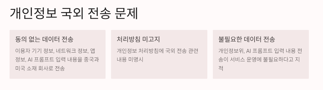 딥시크는 서비스 출시 당시 이용자의 기기 정보, 네트워크 정보, 앱 정보, 그리고 AI 프롬프트에 입력된 내용을 중국의 볼케이노 엔진과 미국 소재 회사로 전송했습니다. 그러나 이러한 국외 전송에 대해 이용자의 사전 동의를 받지 않았으며, 개인정보 처리방침에도 관련 내용을 명시하지 않았습니다.