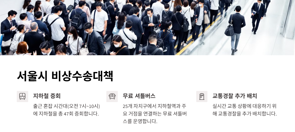 서울시는 준법투쟁으로 인한 시민 불편을 최소화하기 위해 비상수송대책을 마련했습니다. 출근 혼잡 시간대(오전 7시~10시)에 지하철을 총 47회 증회하고, 25개 자치구에서 지하철역과 주요 거점을 연결하는 무료 셔틀버스를 운영합니다.